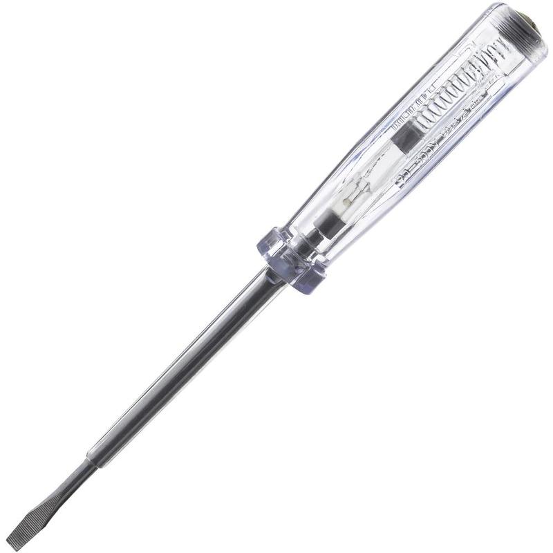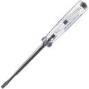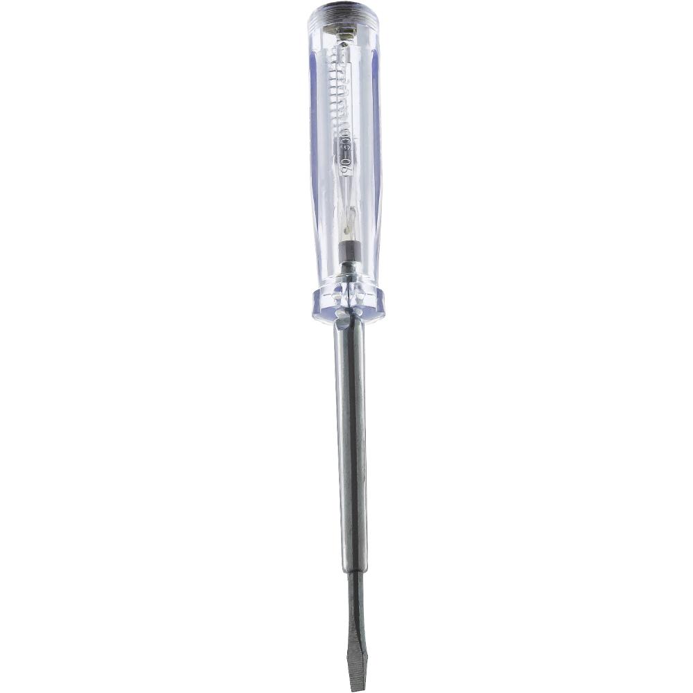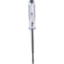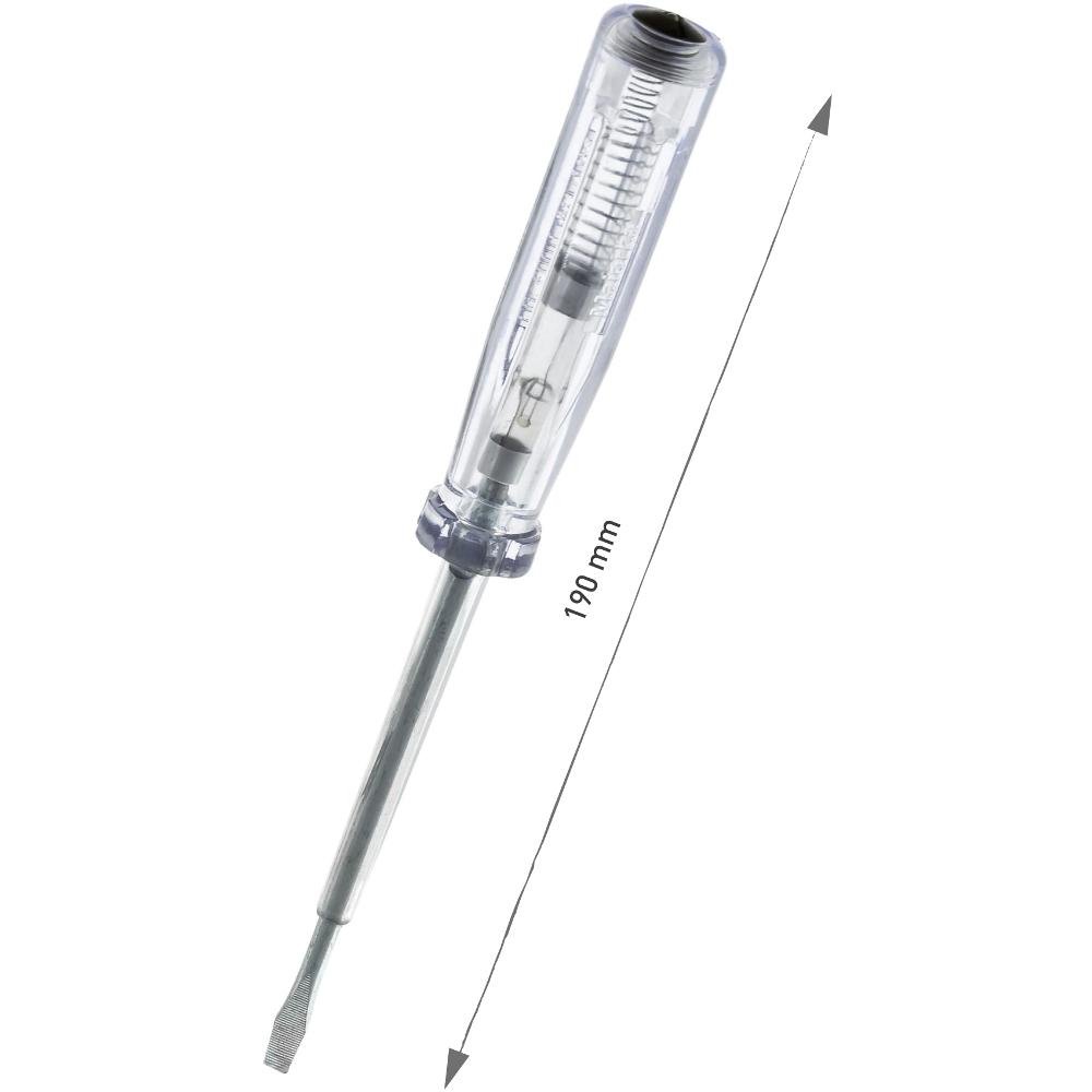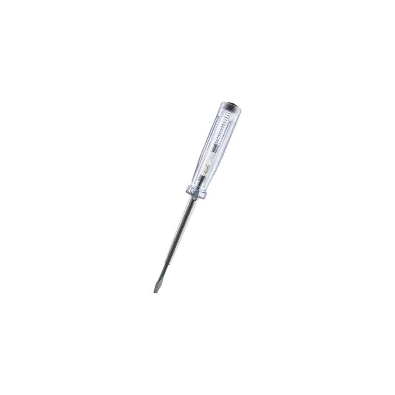 1pólová zkoušečka pro 220 - 250 V AC. Rukojeť z bílého transparentního plastu. Testovací elektroda zabudovaná ve šroubováku