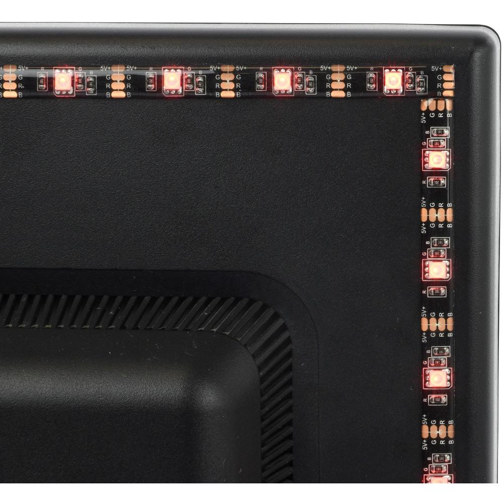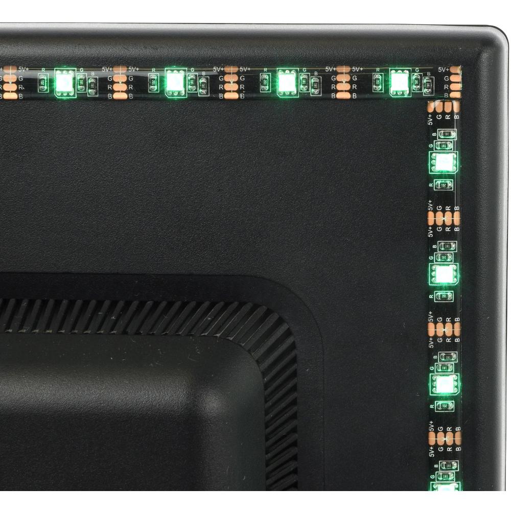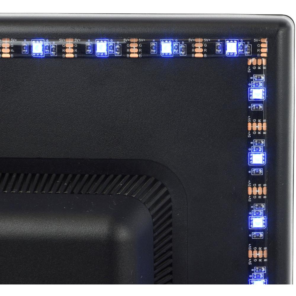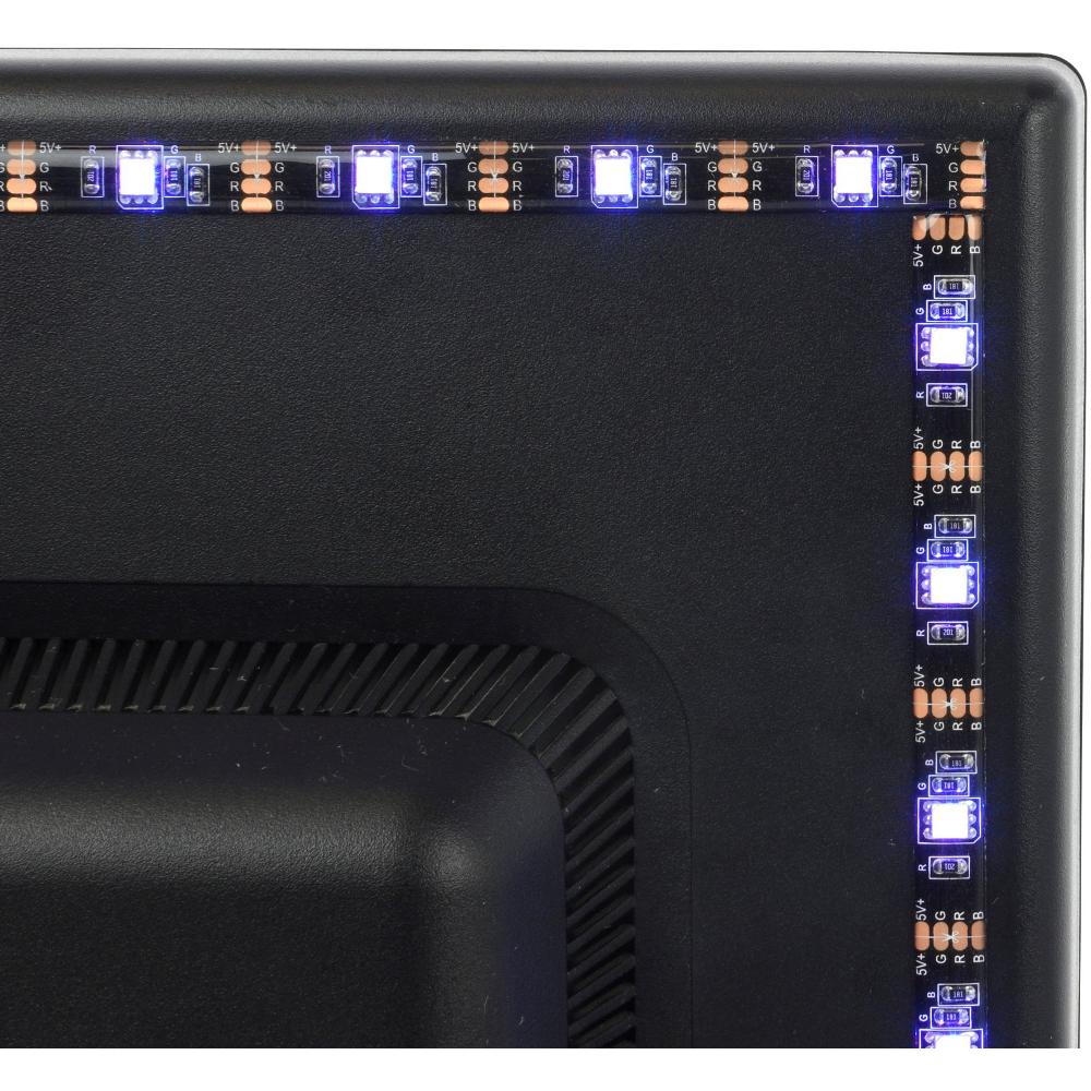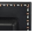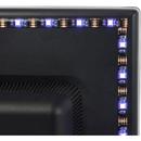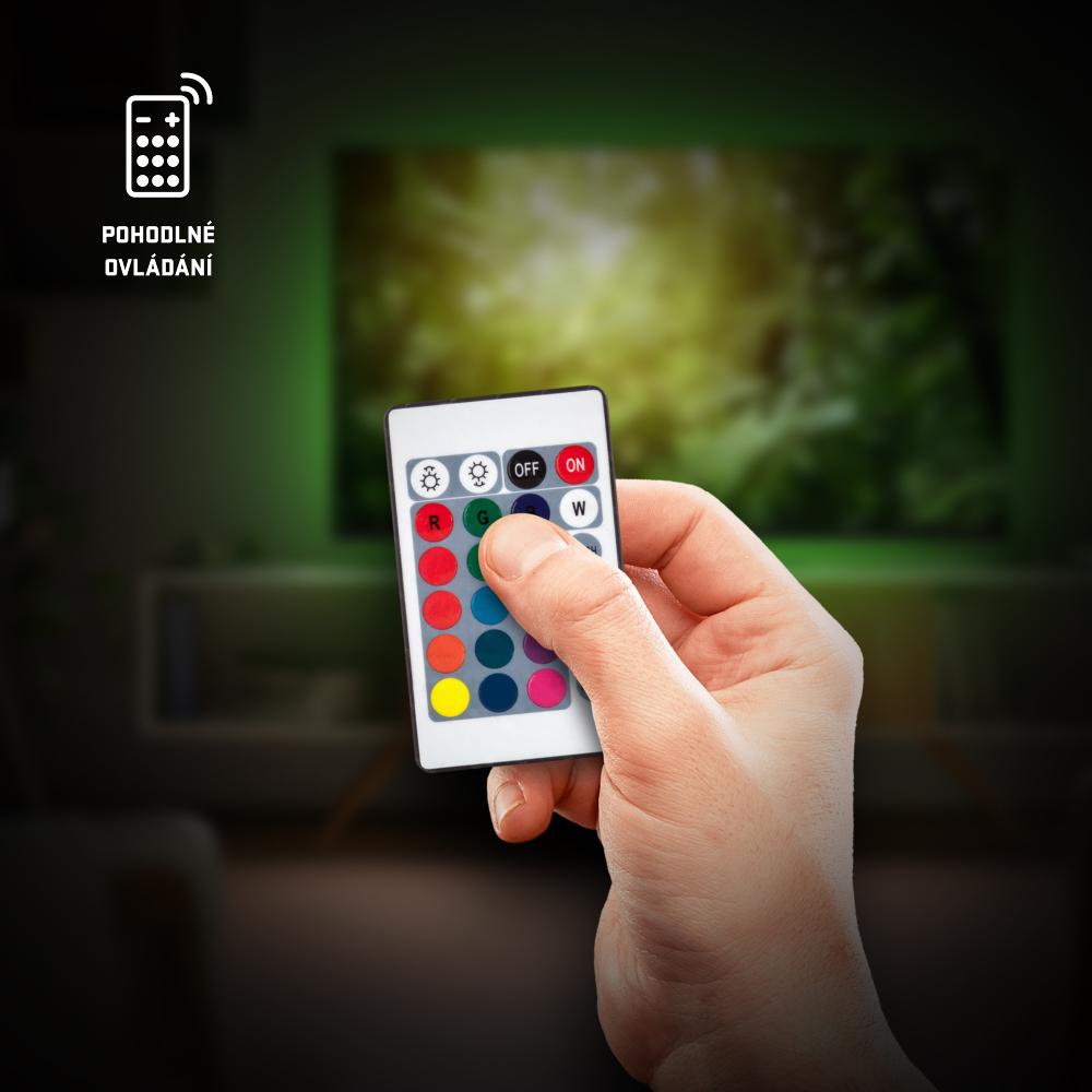 RGB LED pásek 2×50cm do konektoru USB s dálkovým ovládáním. Ideální pro podsvícení televizorů a monitorů a pro různá dekorativní podsvícení. Díky dálkovému ovládání lze barvy snadno měnit z pohodlí pohovky. Nabízí také změnu intenzity podsvícení a program pro střídání barev podsvícení. Zapojuje se do USB konektoru televizoru. LED pásky se pomocí oboustranné lepící pásky upevní na požadované místo. Produkt omezuje únavu při práci s PC nebo při sledování televize.