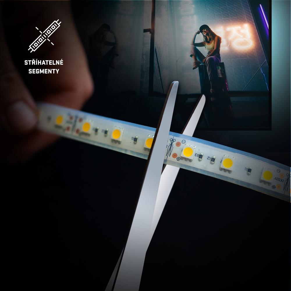 Není nutné mě dlouze připevňovat, stačí mě jednoduše přilepit na zadní stranu televize či monitoru a připojit do pomocí USB. Nemusíš se přitom bát, že bych nějak nevzhledně vyčníval a zíral na tebe přes okraj obrazovky – odstřižením mých jednotlivých segmentů si totiž můžeš upravit mou délku k obrazu svému (a své televize). Zkrátka žádná věda.