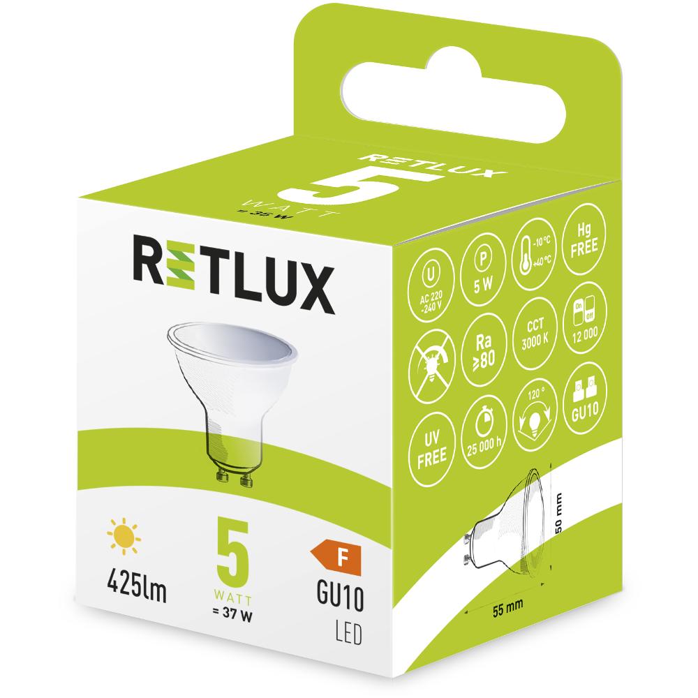 Reflektorové LED žárovky Retlux do patice GU10 se používají nejčastěji v podhledech, bodových světlech či v koupelnách. Jedná se o menší žárovky, které spolehlivě osvítí menší plochu či ve větším množstvím i rozměrnější místnost. Na výběr máte hned několik variant od 5 W do 9 W, což by u běžných žárovek znamenalo 37 W až 61 W.
