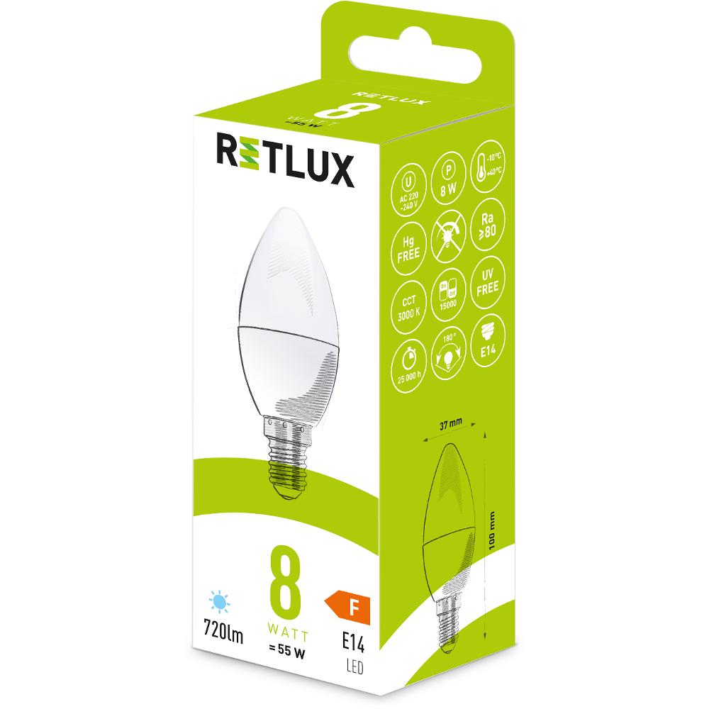 Žárovky ve tvaru svíček najdou dozajista uplatnění v ozdobných lustrech, závěsných svítidlech či např. v lampách. Tento již léty osvědčený tvar se však dočkal technologického pokroku. Retlux LED žárovky do patice E14 mají násobně menší spotřebu než její předchůdkyně, a vynikají rovněž vysokou životností, která se pohybuje v řádech desítek tisíc hodin.