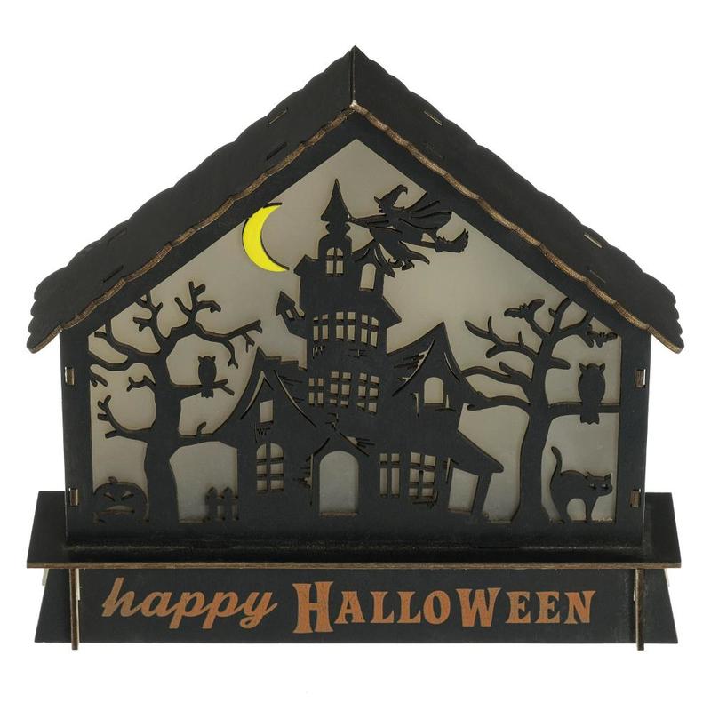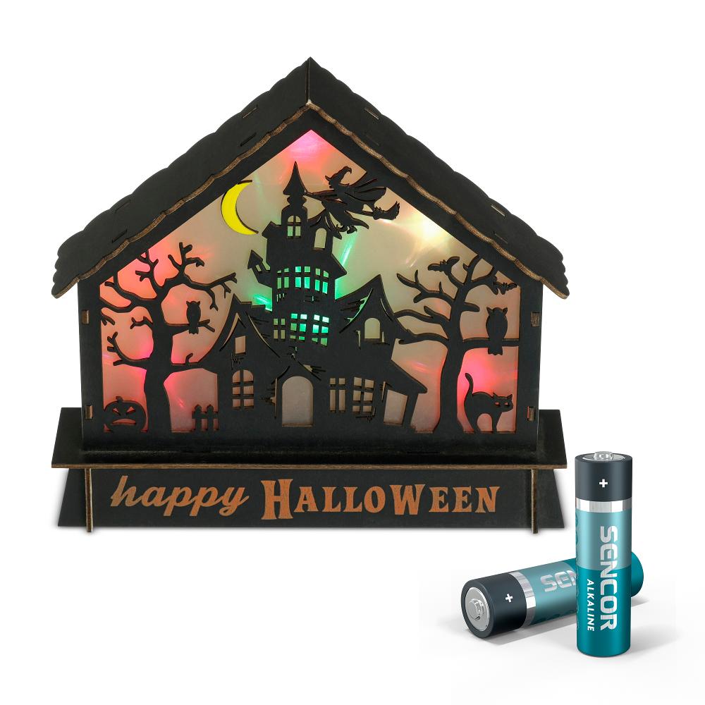 Strašidelný hrad 6 LED, měnící se barvy, RGB světlo, dřevo, napájení 2x AA, IP20, vnitřní použití