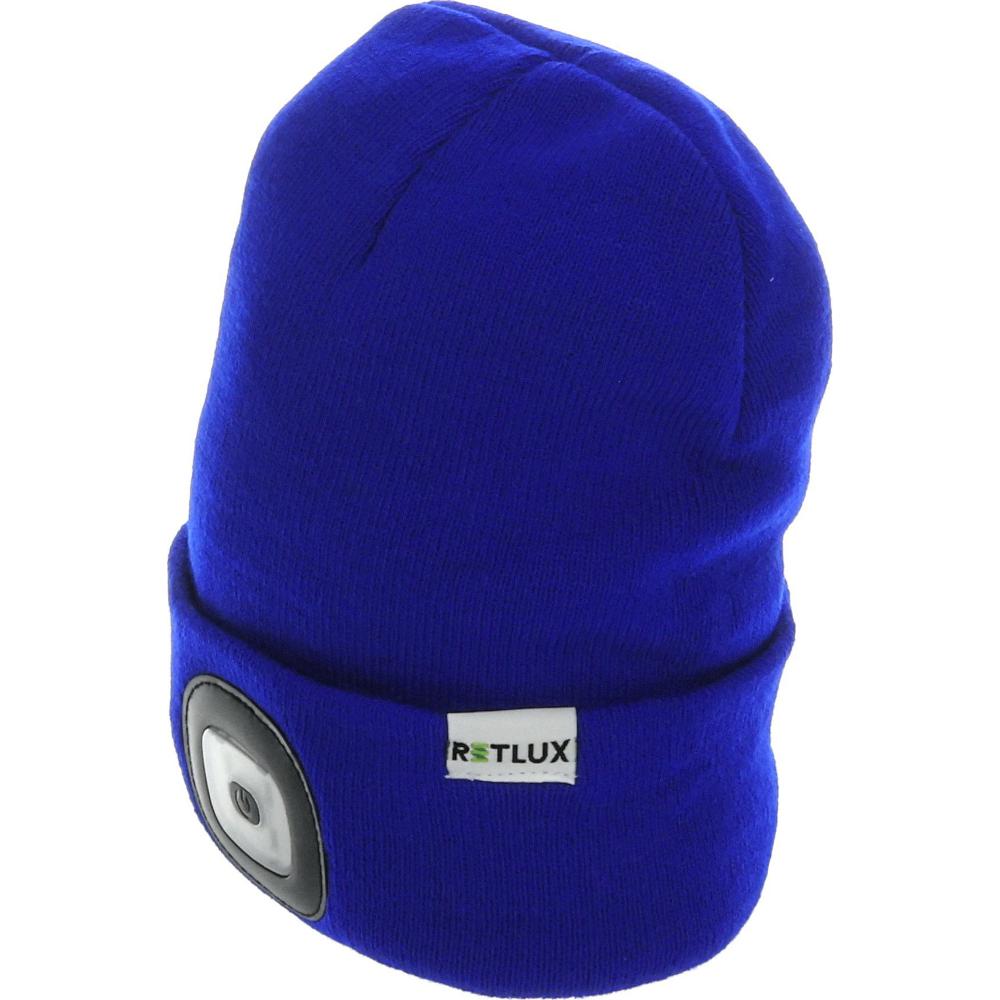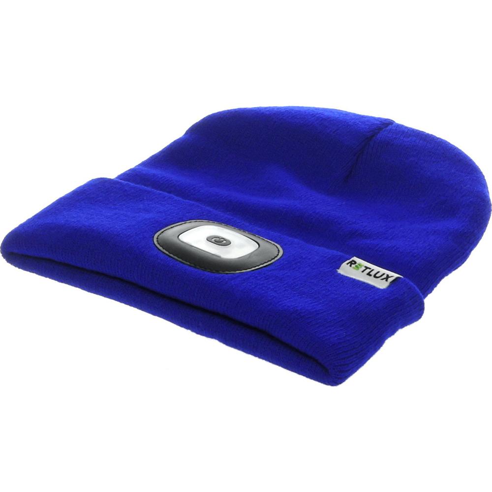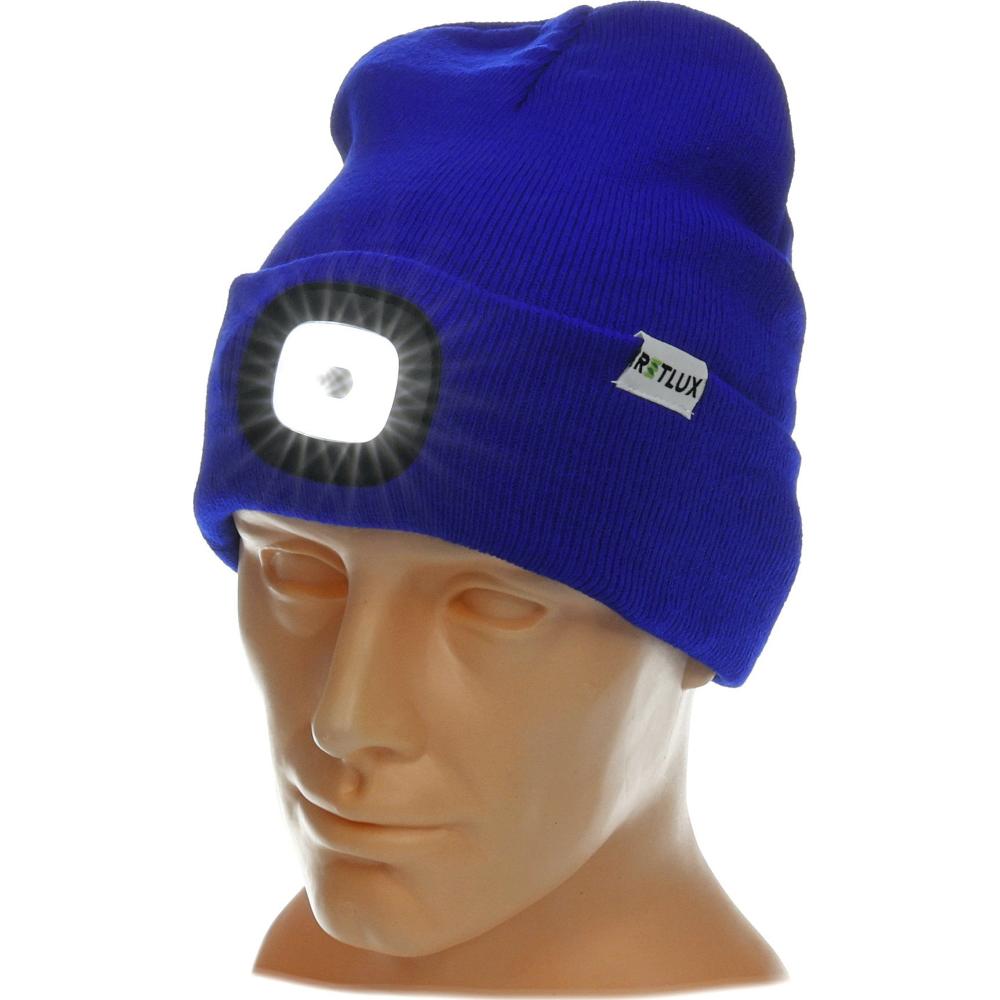 Svíticí nabíjecí čepice modré barvy s LED svítilnou RETLUX. Světlo lze jednoduše vyjmout a čepici vyprat.