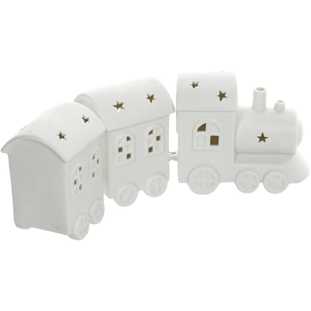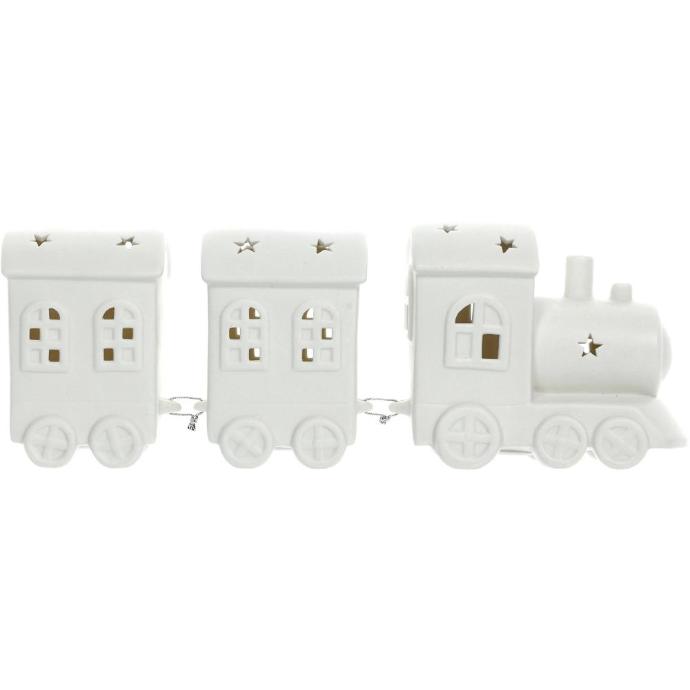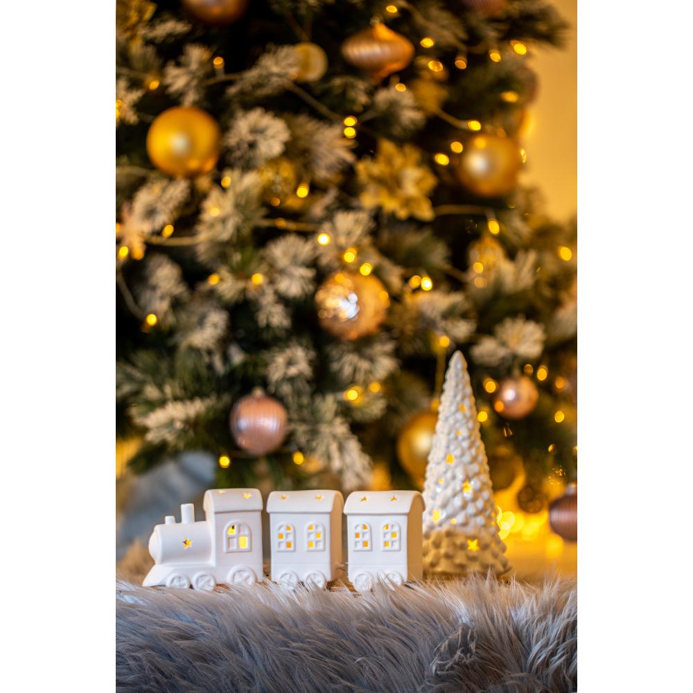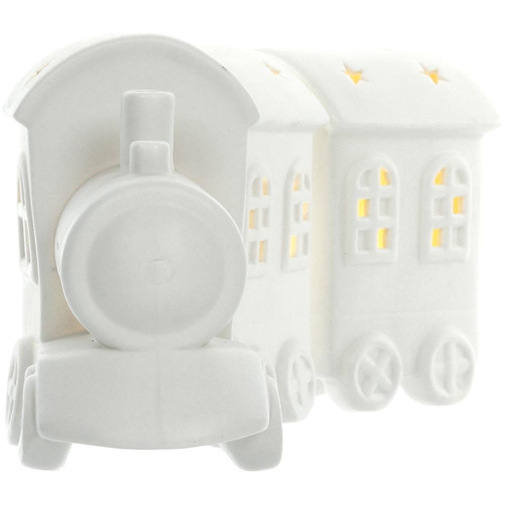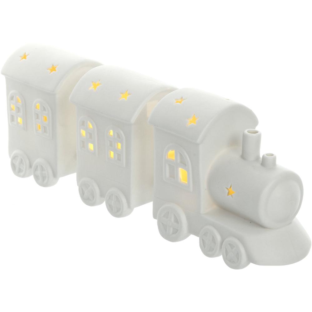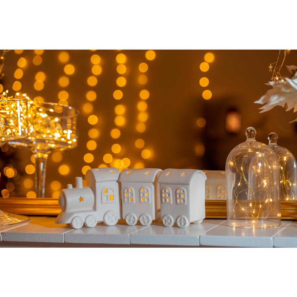 Pokud dáváte přednost dekoracím, u kterých můžete klidně i usnout bez obav, že jste zapomněli sfouknout svíčku, určitě vás potěší naše nabídka keramických dekorací se zabudovaným LED světýlkem. Porcelánová lokomotiva se dvěma vagonky prosvítí vaše domovy.