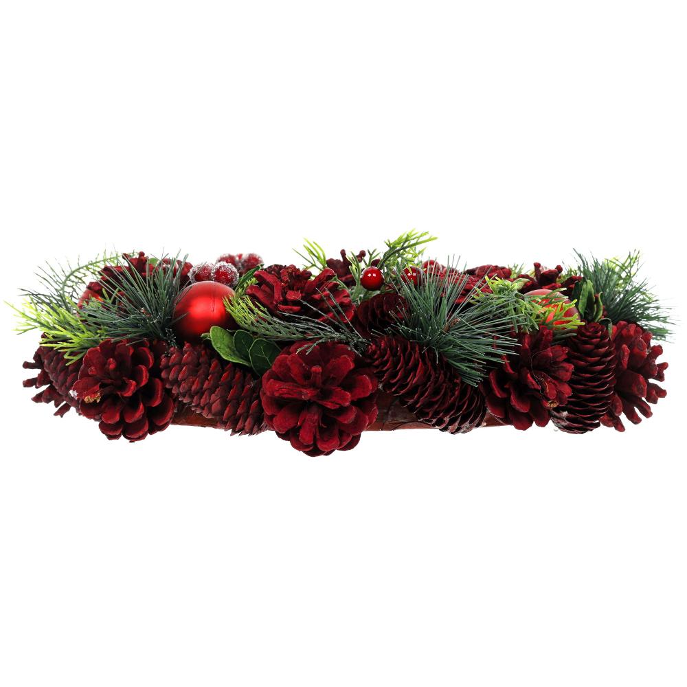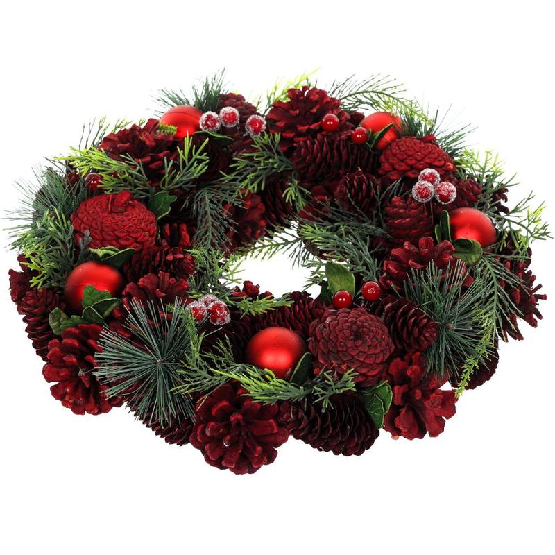 S umělým chvojím a červenými šiškami