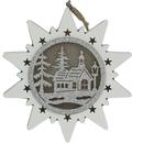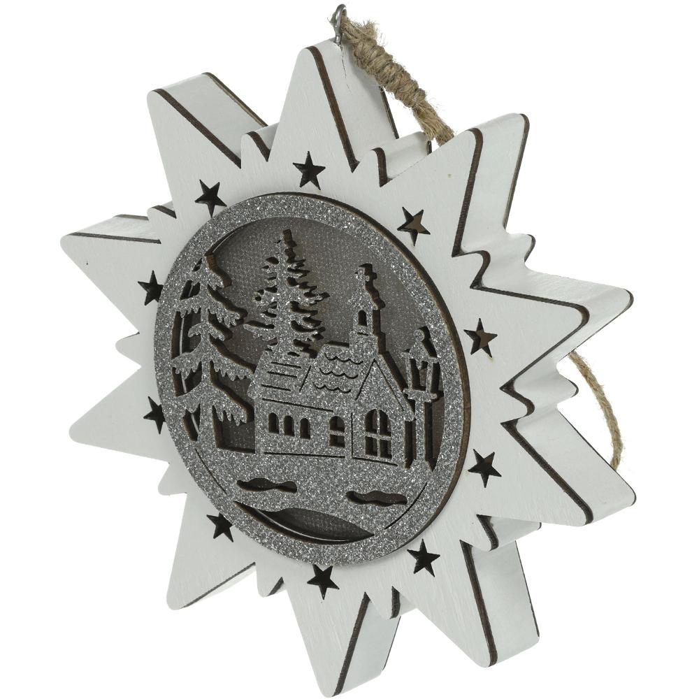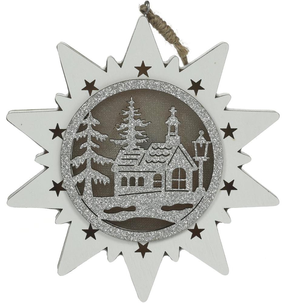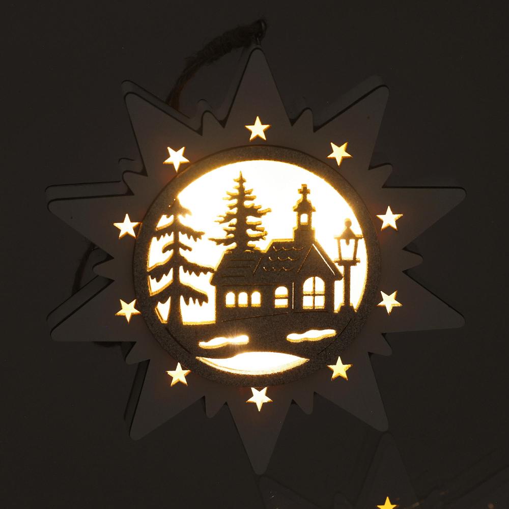 Dřevěná hvězda s vyobrazením kostela