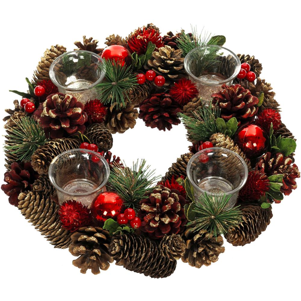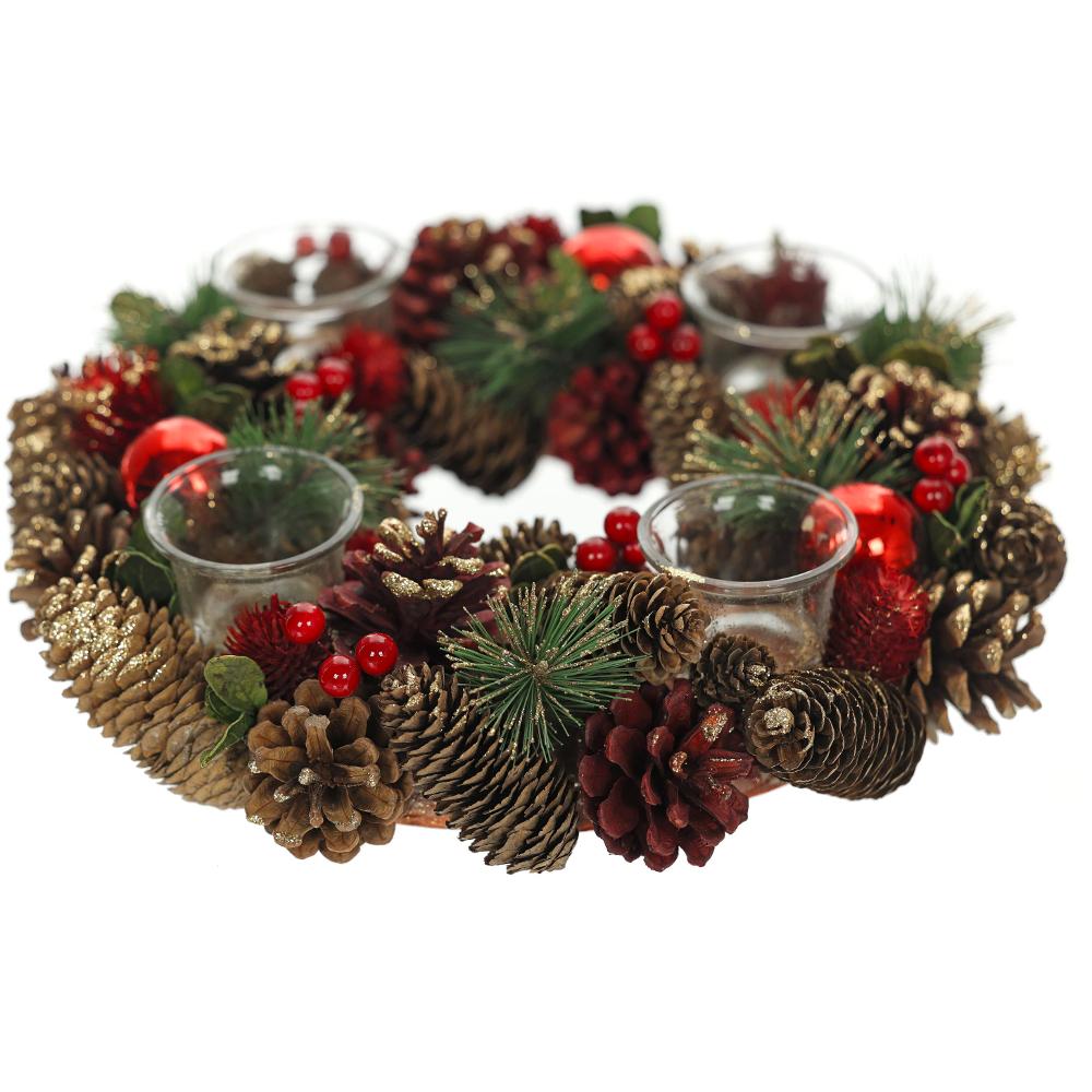 Adventní věnec ze šišek, jehliček a kouliček posypaný zlatými třpytkami